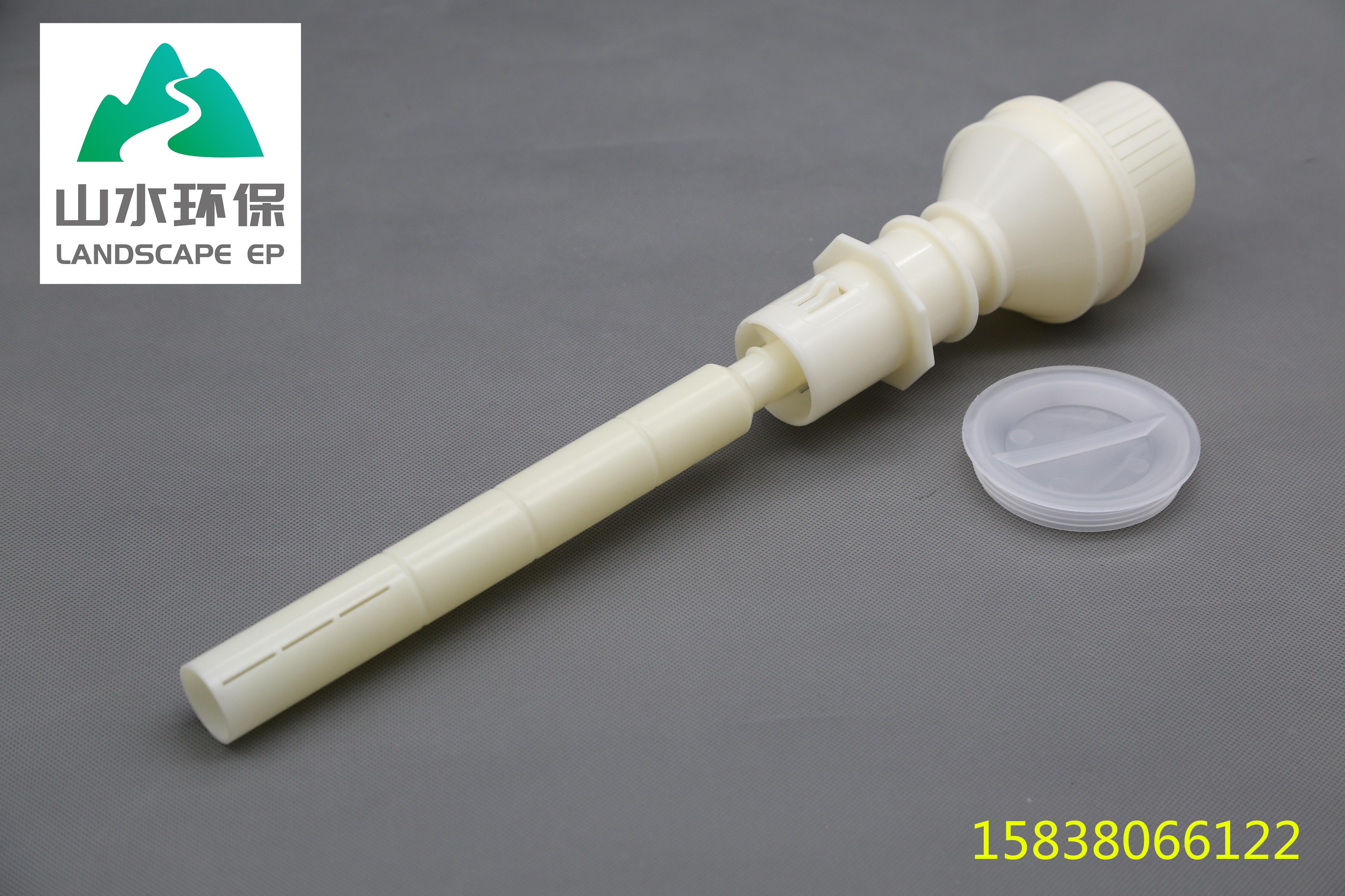 可調式長柄濾頭是一 種由濾桿、預埋件、和濾帽組成的可調節性長柄氣、水反沖濾頭,其特征在于濾桿是通過它上面的外螺紋和預埋件上的內螺紋,使它與預埋件相連接,其濾桿與預埋件之間的相對位置可調,另外在預埋件下部的外柱面上設置有4~8條具有彈性呈斜面狀的倒鉤,在預埋件上部的圓周邊端面上開有鋸齒形的斜齒,濾帽也是通螺紋與預埋件的上部相連,同時在濾帽中間圓盤的下端面也開有鋸齒形的斜齒,其斜齒的方向與預埋件上的斜齒方向相反。