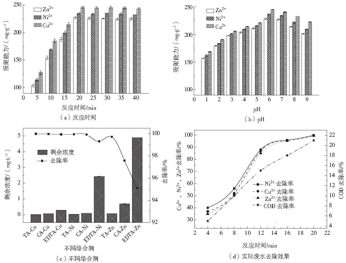 在室溫條件下,取250 mL、100 mg·L−1模擬CA-Cu、CA-Ni、CA-Zn廢水置于250 mL 錐形瓶中,加入0.1 g重金屬捕集劑PADTC,置于搖床中振蕩5 min后再靜置15 min,取上清液過濾后用原子吸收分光光度計測定溶液中殘留的重金屬離子濃度,分別研究了pH和反應時間對PADTC去除重金屬的影響,以及對CA、TA、EDTA 3種絡合劑與Cu、Ni、Zn 3種重金屬離子絡合后的處理效果。