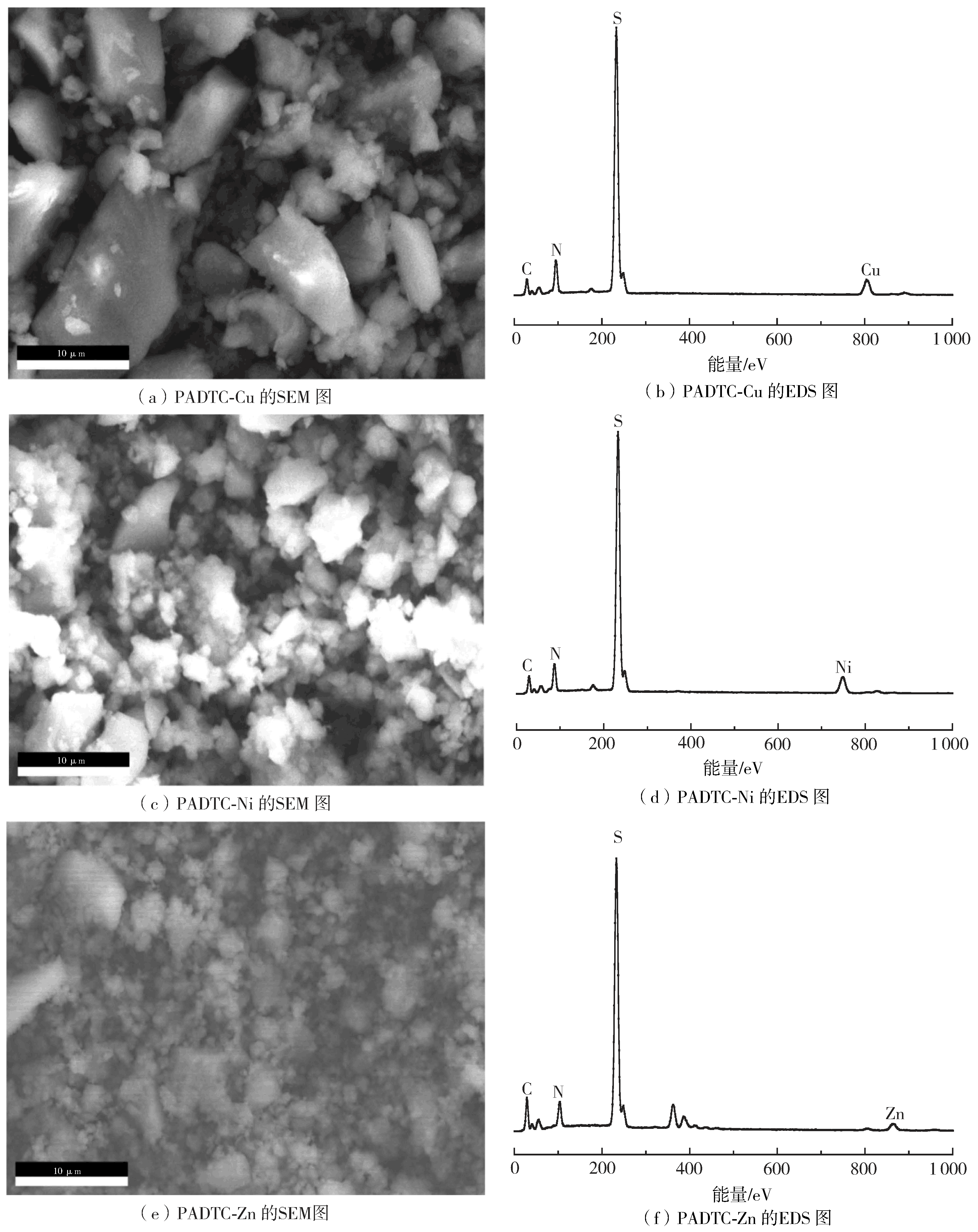 沉淀PADTC-Cu、Ni和Zn的電鏡掃描-能譜(SEM-EDS)分析如圖6所示,沉淀PADTC-Cu、Ni和Zn的電鏡掃描圖6(a)、(c)、(e)均顯示沉淀表面疏松多孔。其對應的能譜圖上分別有Cu、Ni和Zn元素峰出現(xiàn),與 PADTC的元素分析相比較,Cu、Ni和Zn元素峰的出現(xiàn)表明PADTC捕集到了重金屬離子Cu、Ni和Zn 。